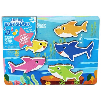 Plays the Baby Shark Song! Baby Shark Chunky Wood Sound Puzzle provides a fun, engaging way for children to learn shape and sound recognition. Best of all, they get to hear the song they love over and over again.Thick pieces that are perfect for little hands. Big, chunky pieces fit securely into board spaces, triggering the song that started it all—the Baby Shark Song. Features Mommy Shark, Daddy Shark, Grandma Shark, Grandpa Shark, and, of course, Baby Shark. If you doo doo doo not know Baby Shark, you’re missing the boat! Baby Shark has taken over YouTube and we’ve taken to creating a wood sound puzzle featuring this global phenomenon. Big, chunky pieces fit securely into board spaces, triggering the song that started it all—the Baby Shark Song. For ages two and up. Requires two AAA batteries (not included).